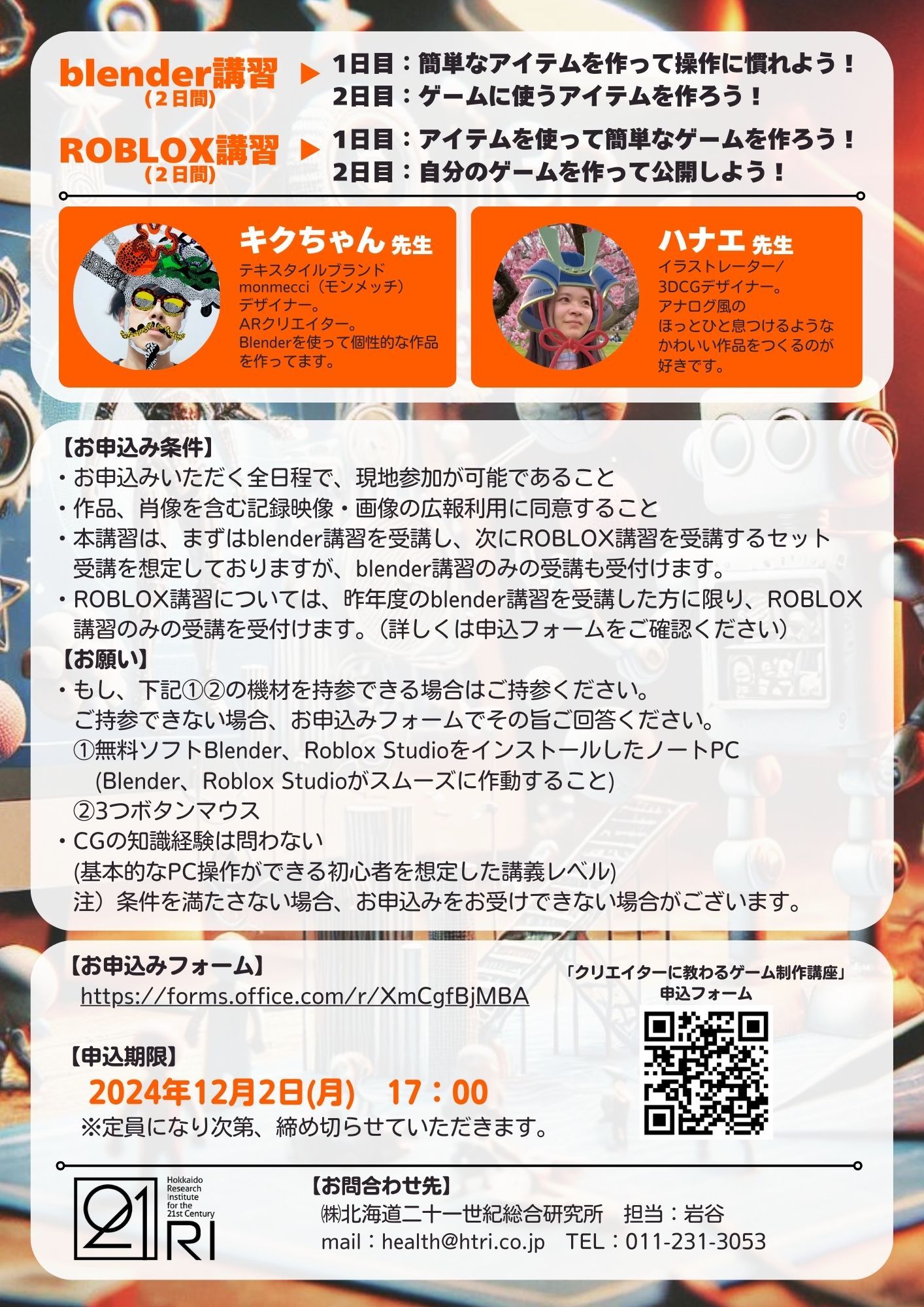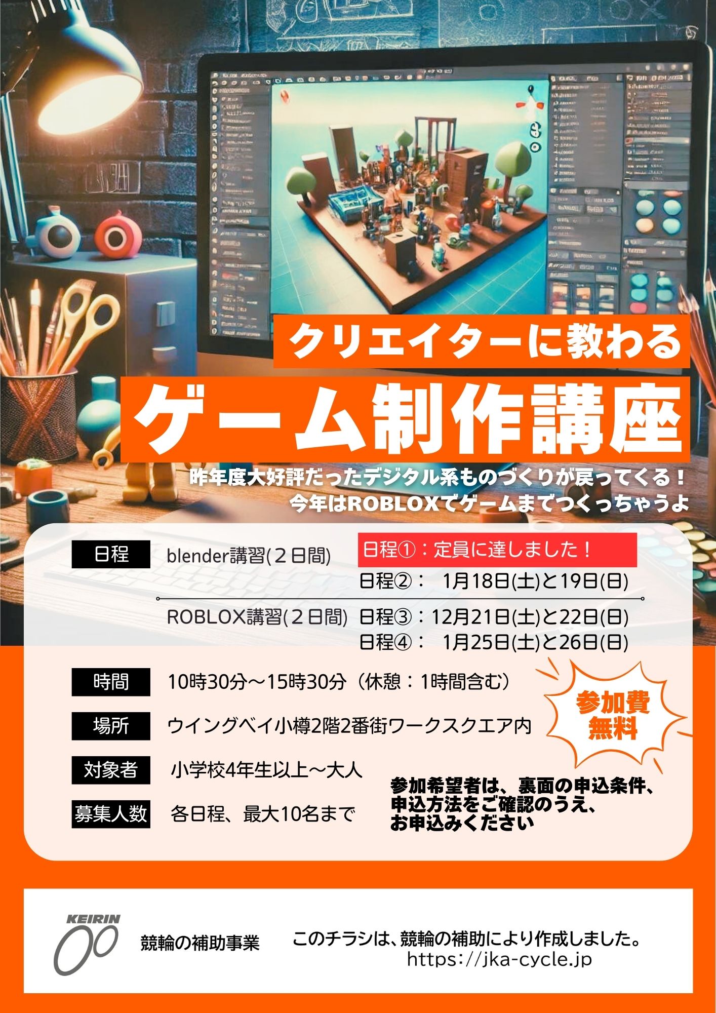 昨年度大好評だったデジタル系ものづくりが戻ってくる! 今年はROBLOXでゲームまでつくっちゃうよ 【申込期限】 2024年12⽉2⽇(⽉) 17:00 ※定員になり次第、締め切らせていただきます。