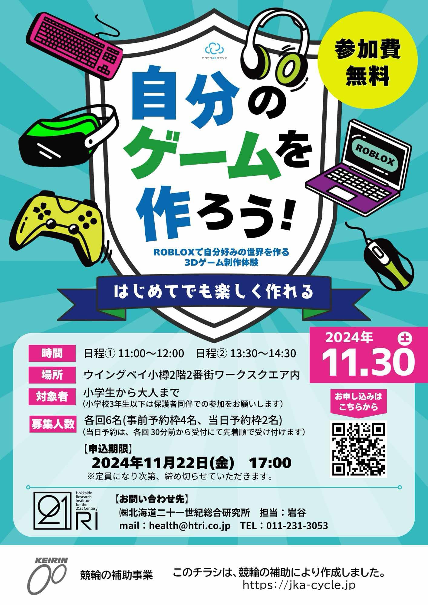 2024年11月30日(土)に「オアソビプロジェクト」の一環として、ウィングベイ小樽 2番街2階済生会ワークスクエアではRobloxを使った「自分のゲームを作ろう!」イベントを開催。